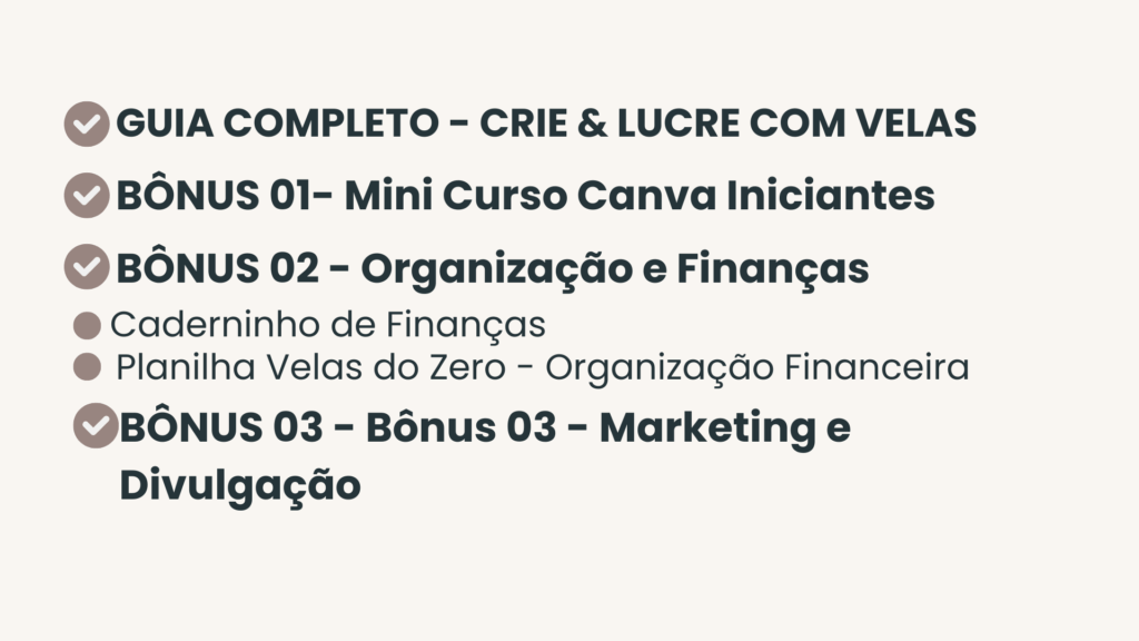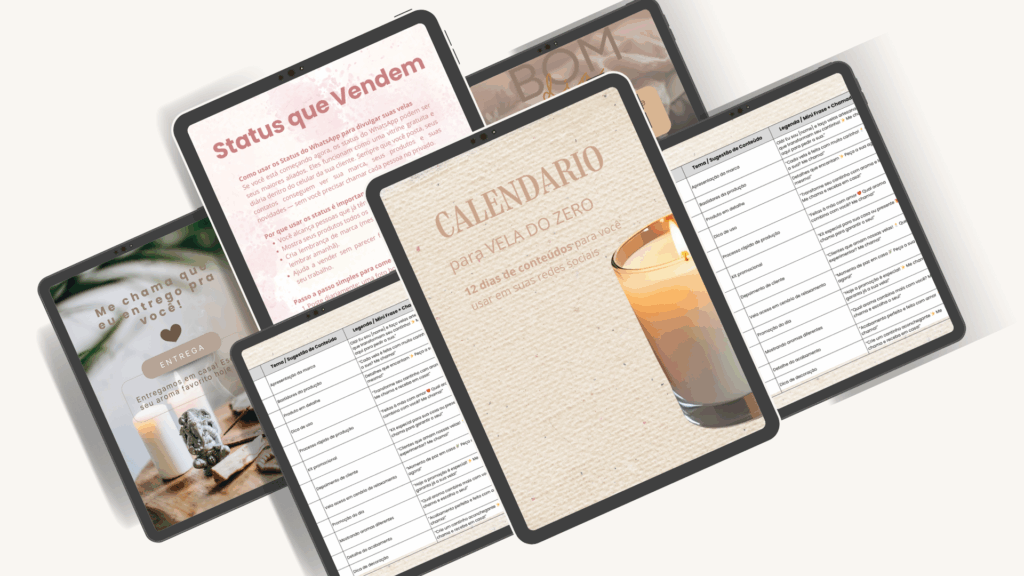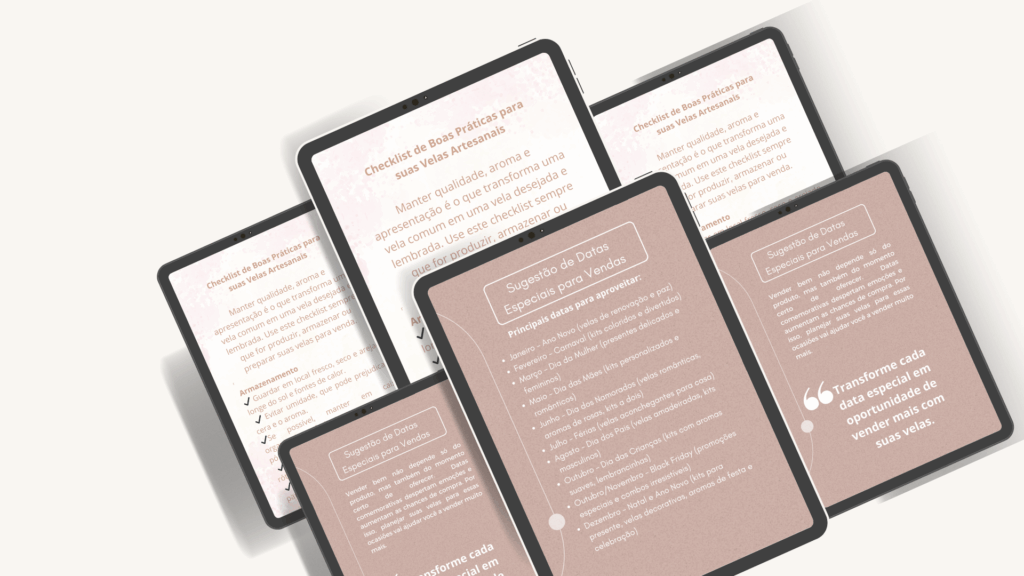 Produção e Crescimento – organize sua produção, siga datas especiais para vendas e use nosso checklist de boas práticas para fragrâncias, armazenamento e apresentação das velas.